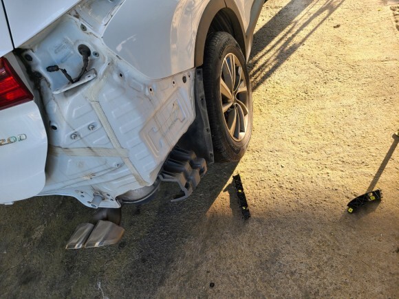 사고차형들 현대 싼타페 2.0D 후면 조수석 뒷범퍼 휀다 몰딩 휠 복원교체 및 판금도색 한화보험건 (전국 자동차 부품 연합)
